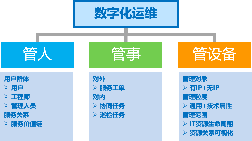 通過結(jié)構(gòu)化分析,我們發(fā)現(xiàn)運維管理主要集中在管人、管事、管設備(資源)三個方面,將信息中心的運維資源進行歸并整理集中存儲,形成運維協(xié)作共享平臺以提高工作溝通效率,提供量化的運營數(shù)據(jù)為輔助決策提供數(shù)值依據(jù),最終形成有效的可落地方案。
